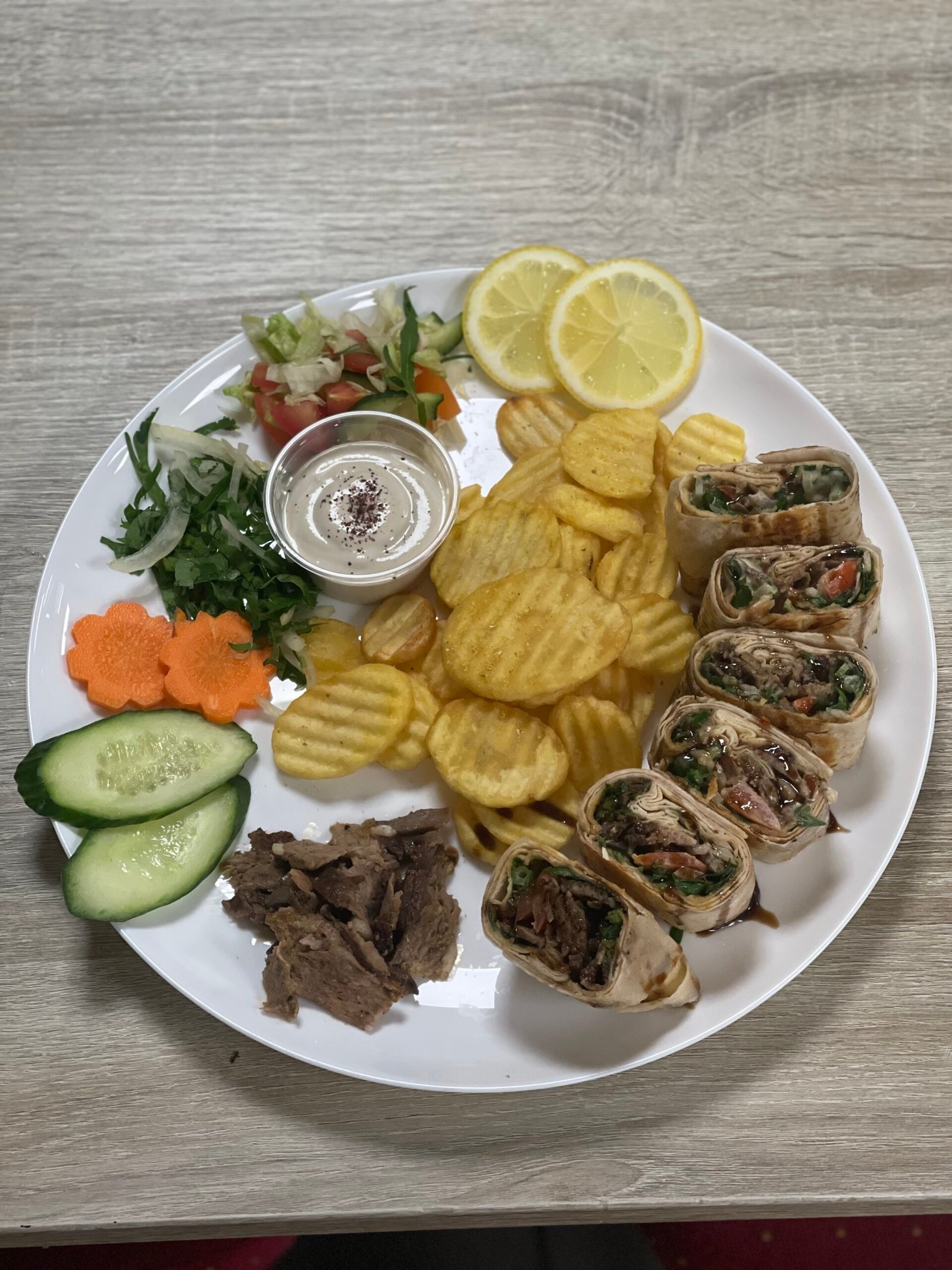 Kalvekød med tahina sauce, grøntsager, løg og persille.