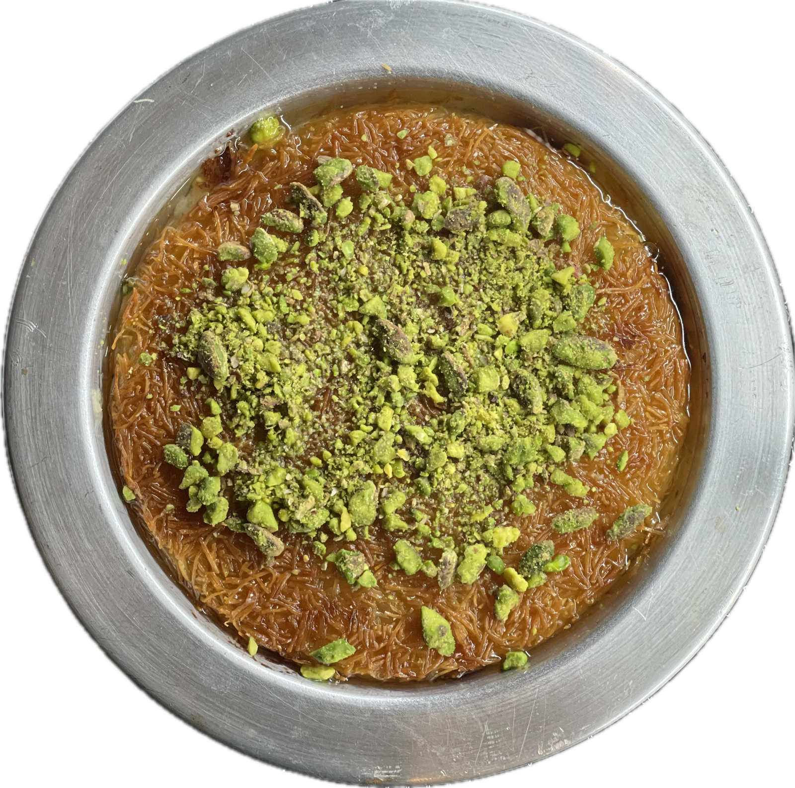 Grov knafeh dej med ost, ghee, sirup og pistacienødder.